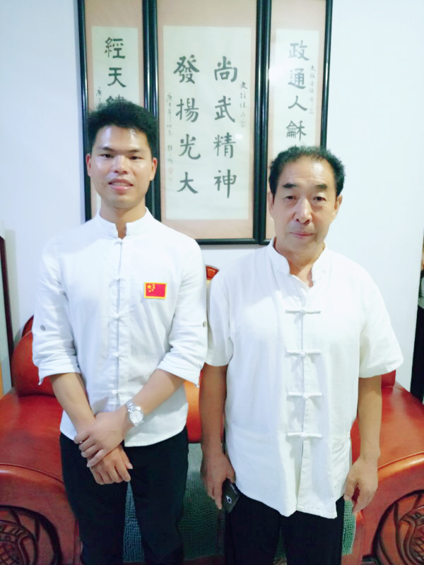 | 国家级非遗八卦掌传承人任文柱(右)与队长蔡传喜合影 |